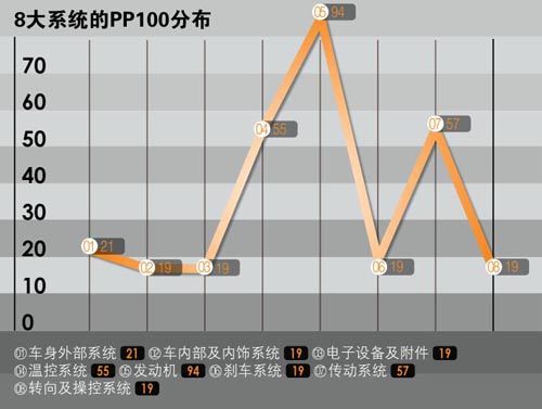 分系統(tǒng)方面,奇瑞瑞虎8個系統(tǒng)的PP100分別為車身外部21、車內(nèi)部及內(nèi)飾19、電子設(shè)備及附件19、溫控系統(tǒng)55、發(fā)動機94、剎車系統(tǒng)19、傳動系統(tǒng)57、轉(zhuǎn)向及操控系統(tǒng)19。以上系統(tǒng)中,奇瑞瑞虎在“車內(nèi)部及內(nèi)飾”以及“電子設(shè)備及附件”中的表現(xiàn)不錯,都排名所在價格區(qū)間14款車中的第三位。不過,奇瑞瑞虎在“溫控系統(tǒng)”和“發(fā)動機”中的表現(xiàn)并不佳,排名分別為第十四位和第十二位,表明未來還有很大提升空間。