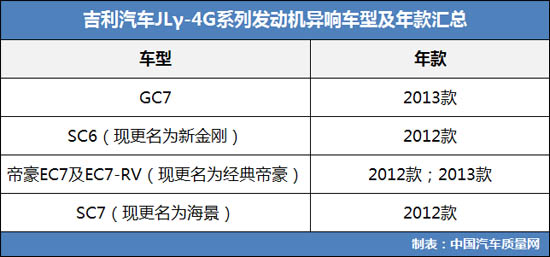 作為國(guó)內(nèi)領(lǐng)先的缺陷汽車產(chǎn)品信息的收集平臺(tái),中國(guó)汽車質(zhì)量網(wǎng)目前接到的吉利反映汽車發(fā)動(dòng)機(jī)異響問題投訴共有60余宗,涉及2013款GC7、2012款SC6(現(xiàn)更名為新金剛)、2012-2013款帝豪EC7及EC7-RV(現(xiàn)更名為經(jīng)典帝豪)、2012款SC7等車型,這些車型均搭載JLγ-4G系列DVVT發(fā)動(dòng)機(jī)。