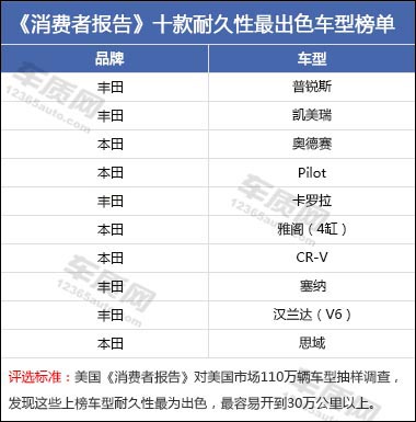 美國(guó)權(quán)威雜志《消費(fèi)者報(bào)告》每年也會(huì)定期發(fā)布車(chē)輛可靠性報(bào)告榜單,國(guó)內(nèi)車(chē)主也可以從中獲取一些跨國(guó)品牌以及國(guó)內(nèi)原型車(chē)的整體可靠性表現(xiàn)水準(zhǔn)。近期,美國(guó)《消費(fèi)者報(bào)告》就通過(guò)對(duì)美國(guó)市場(chǎng)110萬(wàn)輛車(chē)型的抽樣調(diào)查,評(píng)選出10款耐久性出色、最容易安全可靠地開(kāi)到30萬(wàn)公里以上的車(chē)型榜單。