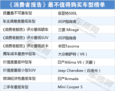 美國《消費(fèi)者報(bào)告》近期從可靠性、滿意度、車主評分、擁車成本、價(jià)值度、燃油經(jīng)濟(jì)性等方面選出十款不值得消費(fèi)者購買的車型,其中包括過去一年銷量猛增而且目前營銷戰(zhàn)打的火熱的Jeep熱門車指南者、自由光。另外,包括菲亞特500L、Mini Cooper S、大眾帕...