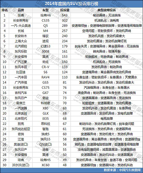2014年度國(guó)內(nèi)SUV投訴排行榜
