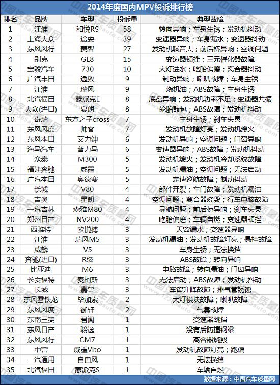 2014年度國(guó)內(nèi)MPV投訴排行榜