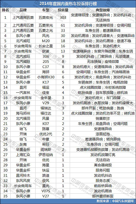 2014年度國(guó)內(nèi)面包車投訴排行榜