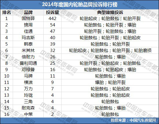 2014年度國(guó)內(nèi)輪胎品牌投訴排行榜
