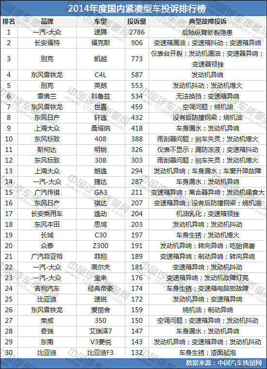 2014年度國內(nèi)緊湊型車投訴排行榜