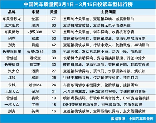 中國汽車質(zhì)量網(wǎng)2013年3月上半月投訴排行