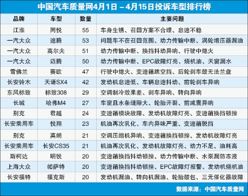雖然較3月下半月的投訴量有明顯萎縮,但作為國內(nèi)領(lǐng)先的缺陷汽車產(chǎn)品信息的收集平臺(tái),中國汽車質(zhì)量網(wǎng)接到的有效車主投訴量在4月上半月繼續(xù)保持在了高位。本時(shí)段,共接到車主投訴1194宗,較去年同期增長1.6倍之多。共涉及車型175個(gè)。 同悅召回方案被質(zhì)疑 ...