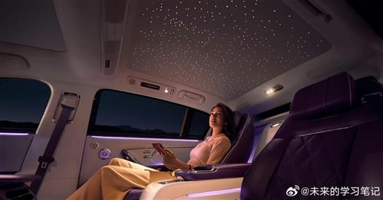 車輛后排設(shè)置雙天窗,可選星空頂,點亮后如繁星漫天;像后排桌板和中通道處,還設(shè)計了追光燈,細(xì)節(jié)和高檔感躍然而出。