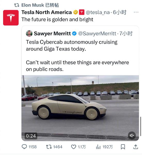 特斯拉 CEO 埃隆?馬斯克在社交平臺(tái)X上轉(zhuǎn)發(fā)了一條關(guān)于特斯拉無人駕駛出租車(Cybercab)的貼文,原文稱:“特斯拉 Cybercab 今天在得克薩斯超級(jí)工廠附近自動(dòng)駕駛巡游。真等不及這些車遍布公共道路的那一天了!币曨l中是一輛金色涂裝的特斯拉 Cybercab。
